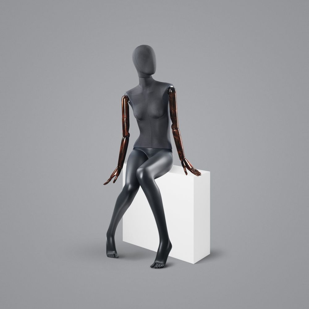 For fashion stores and ateliers seeking exceptional display pieces, we’ve created a line of elegant mannequins—including this versatile seated model with movable joints. Its universal design fits seamlessly into any interior thanks to the balanced mix of materials: grey cotton (torso), graphite fiberglass (legs), and dark wood (arms).