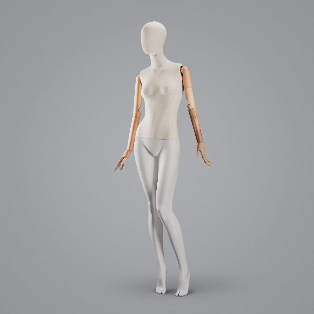 Reinforced fibreglass, top-quality canvas and extremely durable and damage-resistant wooden arms make this product a solution for premium boutiques in particular. They will give your luxury shop display a modern touch while remaining extremely elegant. When ordering this wooden mannequin, you will receive a metal dark grey base in a colour similar to RAL7021 with calf fixing, gloves and correction paint.