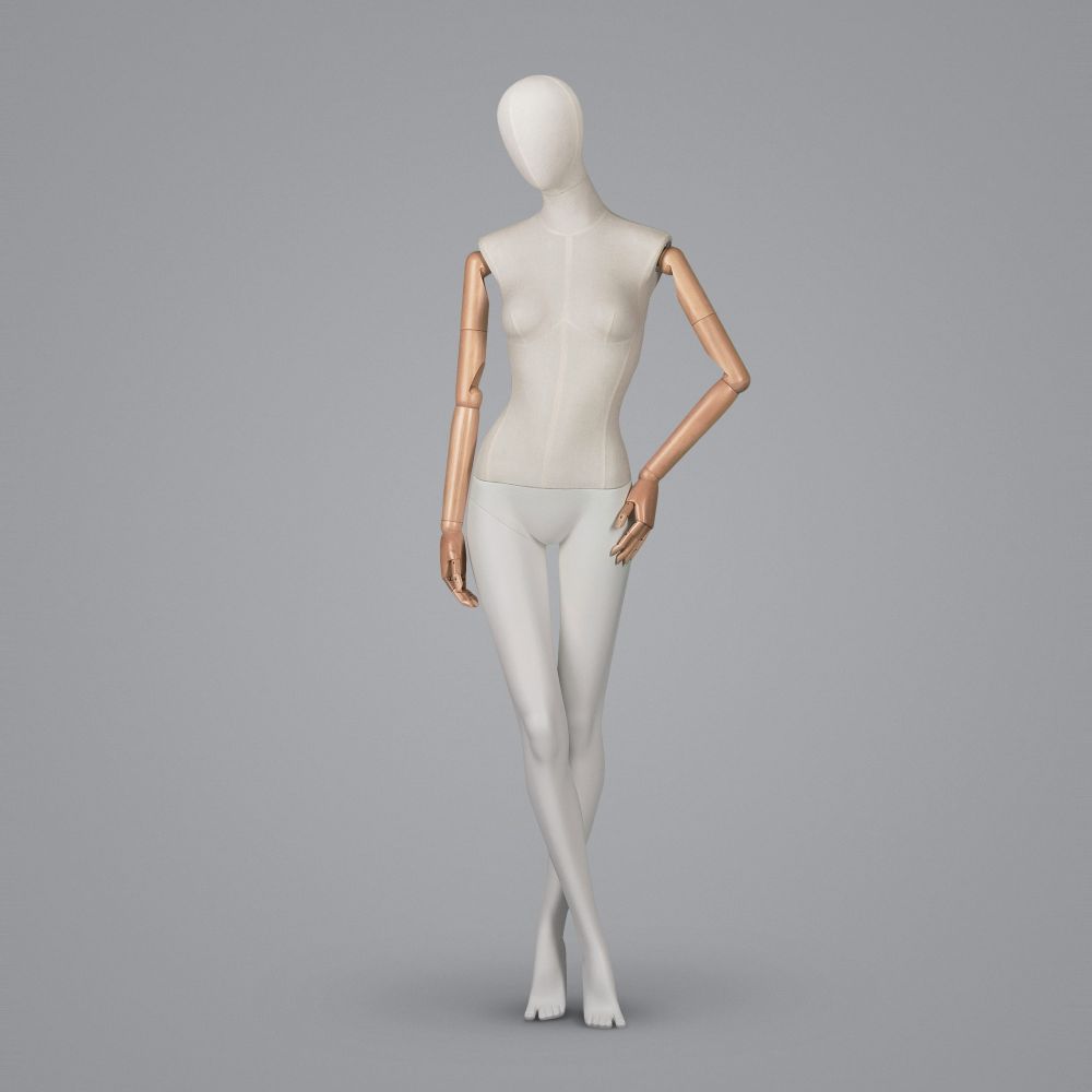 Jak podkreślić piękno kobiecej stylizacji? Co zrobić, aby nadać witrynie nowoczesnego, stylowego charakteru? Projekt doskonałej wystawy w butiku to nie tylko dobór odpowiednich ubrań. Prezentując odzież na luksusowych manekinach wystawowych, sprawisz, że witryna zyska zupełnie nietuzinkowego charakteru. Sekret tkwi w szczegółach. A manekin dekoracyjny ATF-W3 jest odzwierciedleniem tej myśli. Połączyliśmy 3 szlachetne surowce: naturalne drewno, bawełnianą tkaninę oraz włókna szklane o matowym wykończeniu. Sylwetka kobiecego manekina jest ustawiona w fotograficznej pozycji. Nogi są skrzyżowane, talia wygięta w subtelny łuk a głowa skierowana delikatnie w dół. Drewniane ręce manekina są precyzyjnie wykończone. Możemy zmieniać pozycję zarówno ramion, jak i samych dłoni, dopasowując ostateczny wygląd ekspozycji do indywidualnej wizji.