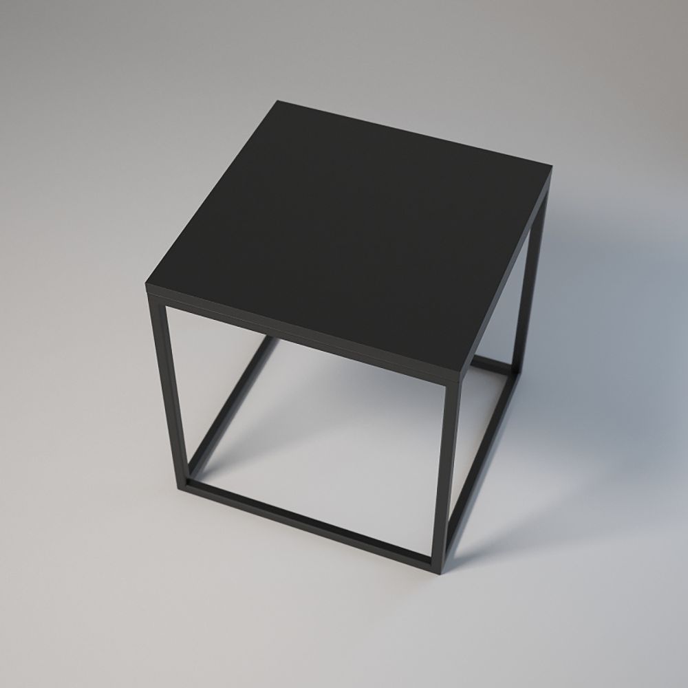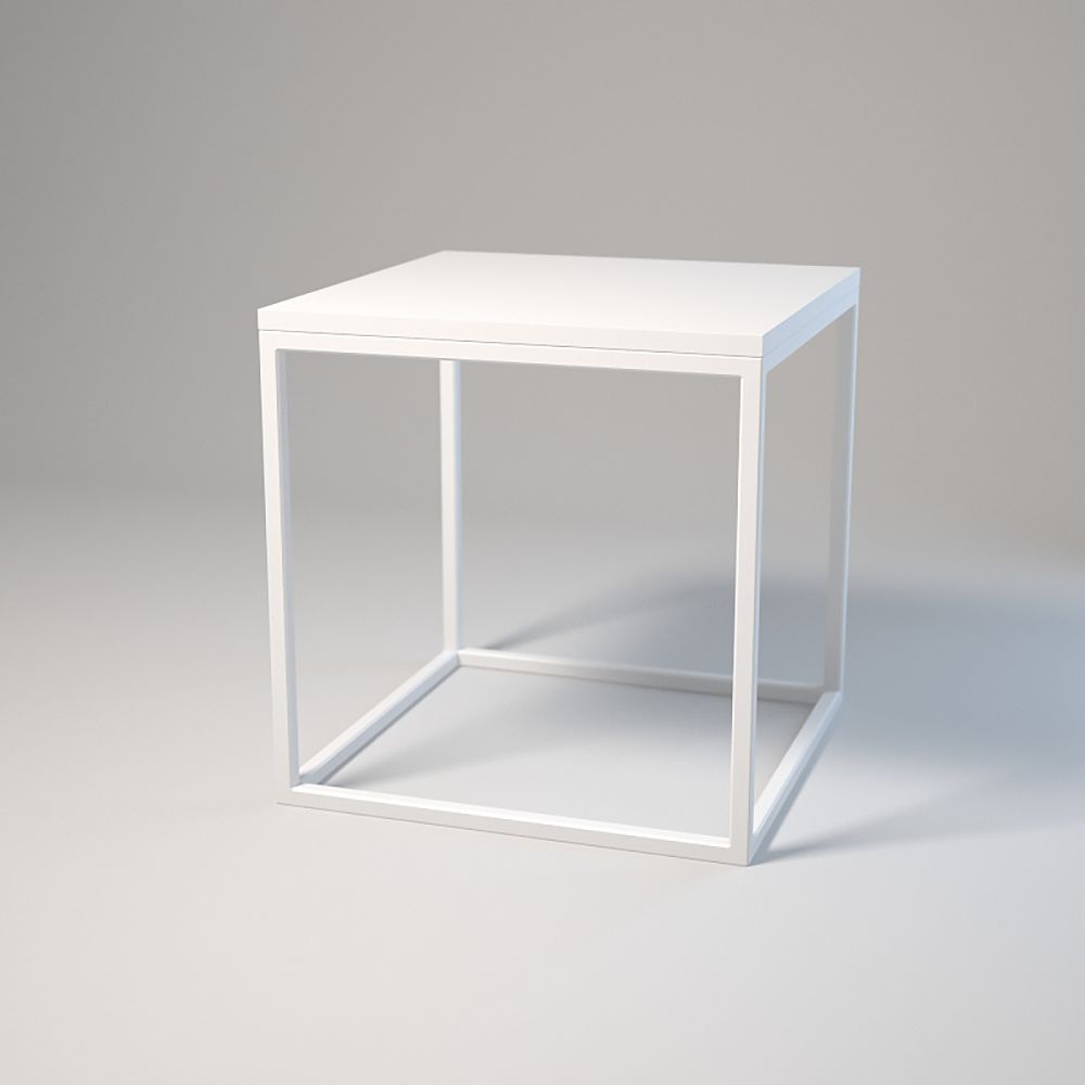 Top: 50x50 cm; Height: 50 cm. Frame made of powder-coated 20x20x1.5 mm steel profiles. Laminated board top with edging, assembled with bolts and sleeves. Adjustable base feet. Colours: white or black.