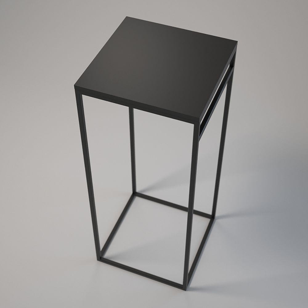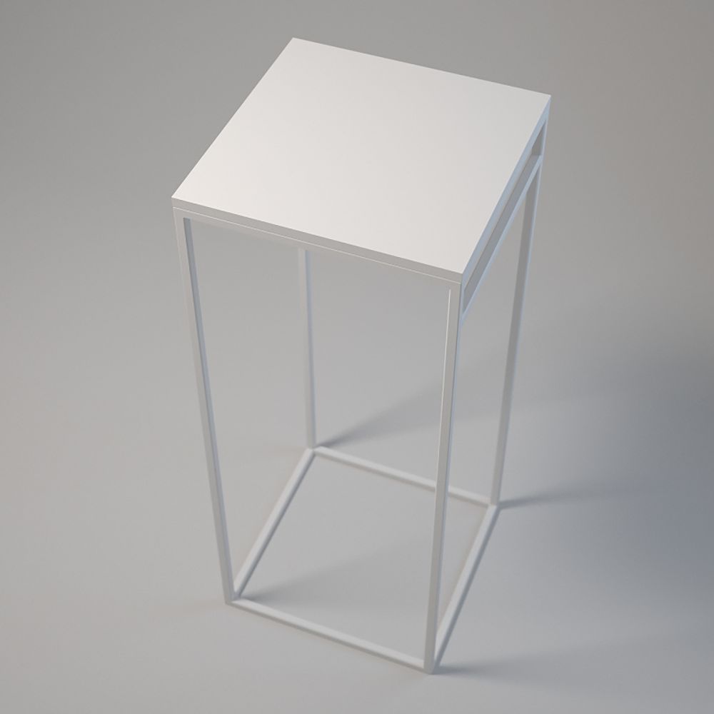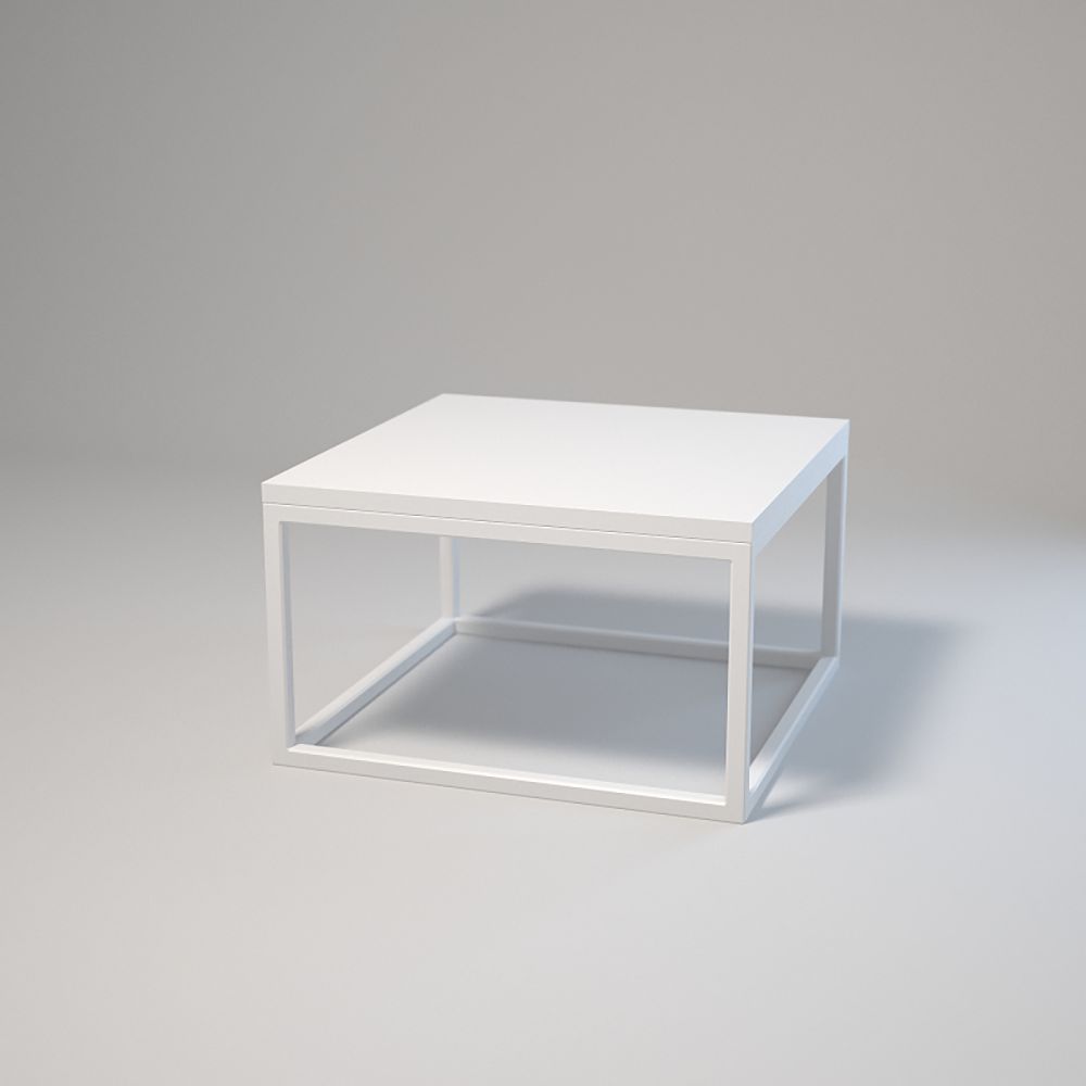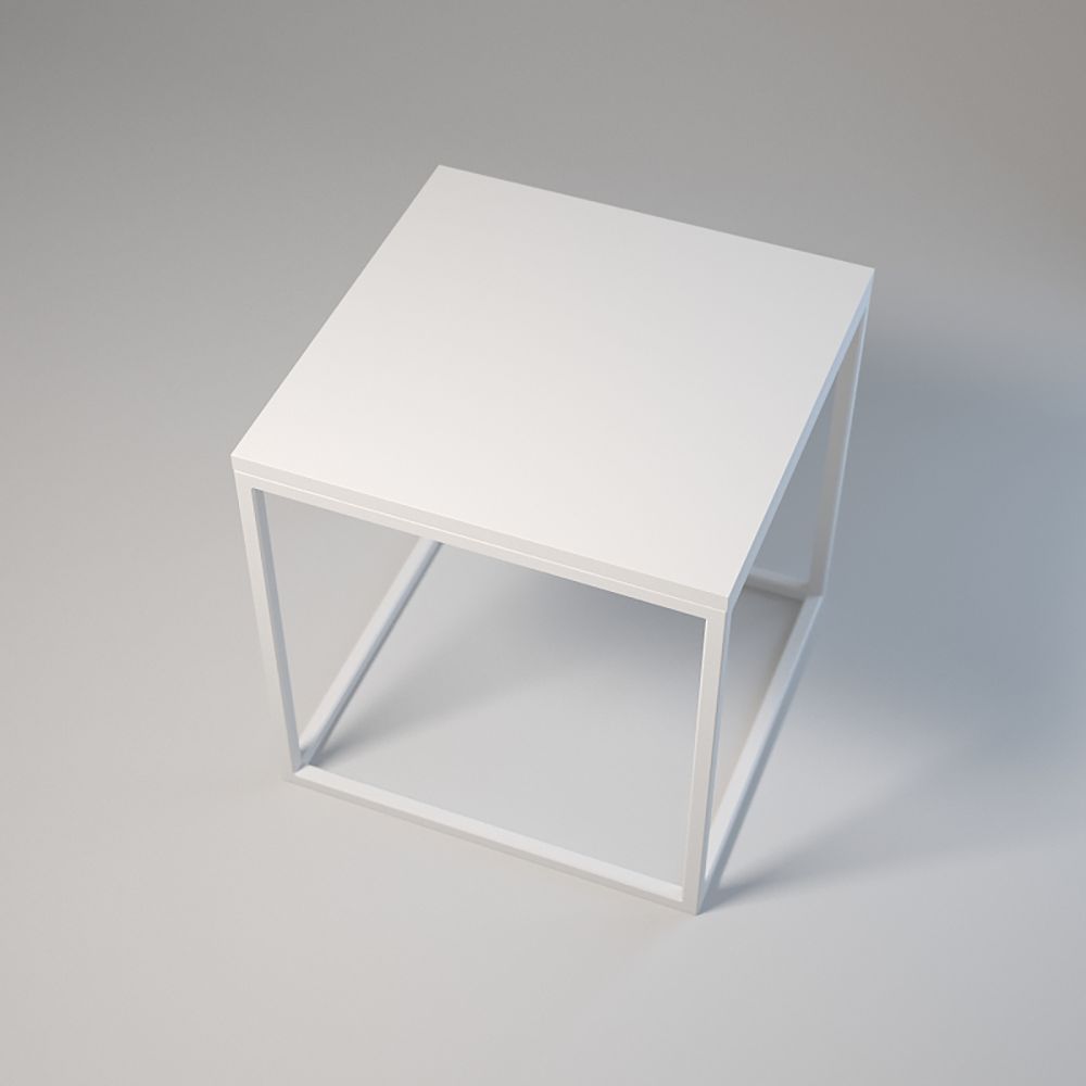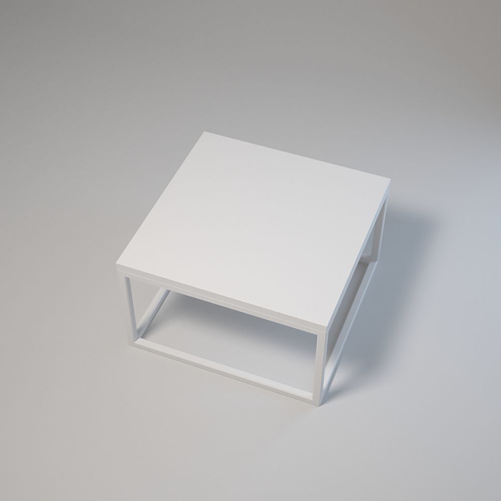 Top: 50x50 cm; Height: 50 cm. Frame made of powder-coated 20x20x1.5 mm steel profiles. Laminated board top with edging, assembled with bolts and sleeves. Adjustable base feet. Colours: white or black.