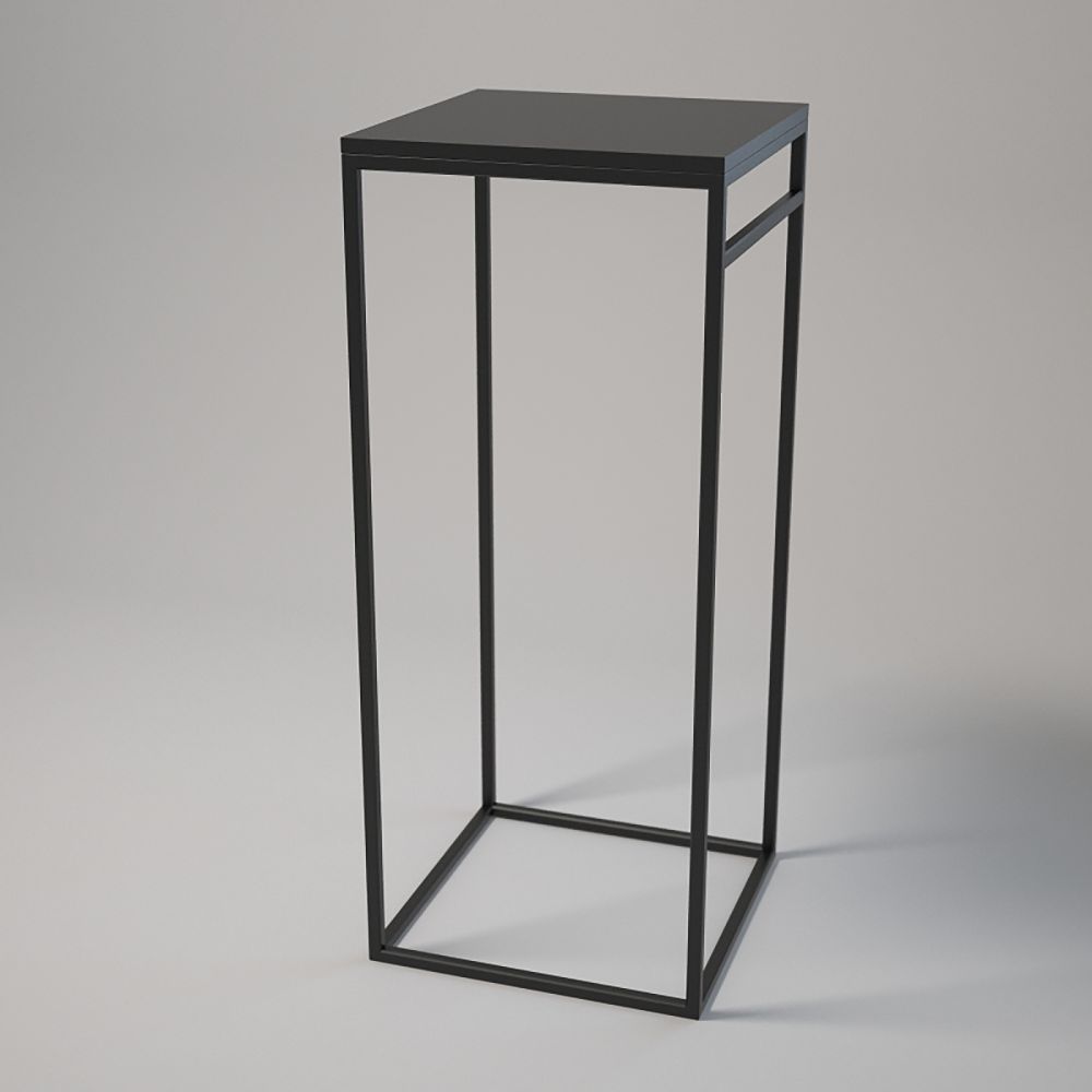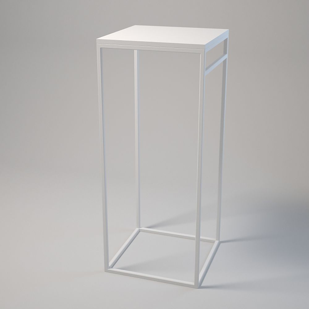 Top surface: 50x50 cm; Height: 120 cm. Powder-coated steel frame (20x20x1.5 mm). Laminated board top with matching edging, secured with bolts and sleeves. Adjustable furniture feet. Colours: white or black