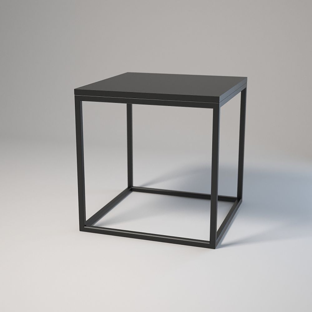 Top: 50x50 cm; Height: 50 cm. Frame made of powder-coated 20x20x1.5 mm steel profiles. Laminated board top with edging, assembled with bolts and sleeves. Adjustable base feet. Colours: white or black.