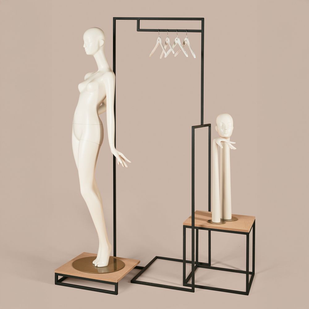The RA220 is a versatile frame that serves as the structural base of the display system. It can be used on its own or combined with pedestals, full-body mannequins or torsos. Ideal as a clothing rack, display stand for accessories, or even an element of interior decoration – it supports the creation of custom retail furniture and evolving shop displays.