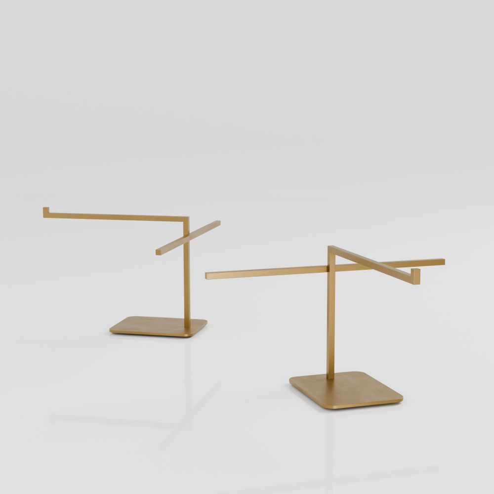 The ES-GY-01-GB model is a retail display stand designed specifically for presenting eyewear – both sunglasses and optical frames. Its minimalist construction and elegant brushed gold finish make it ideal for modern fashion brands and premium retail concepts.