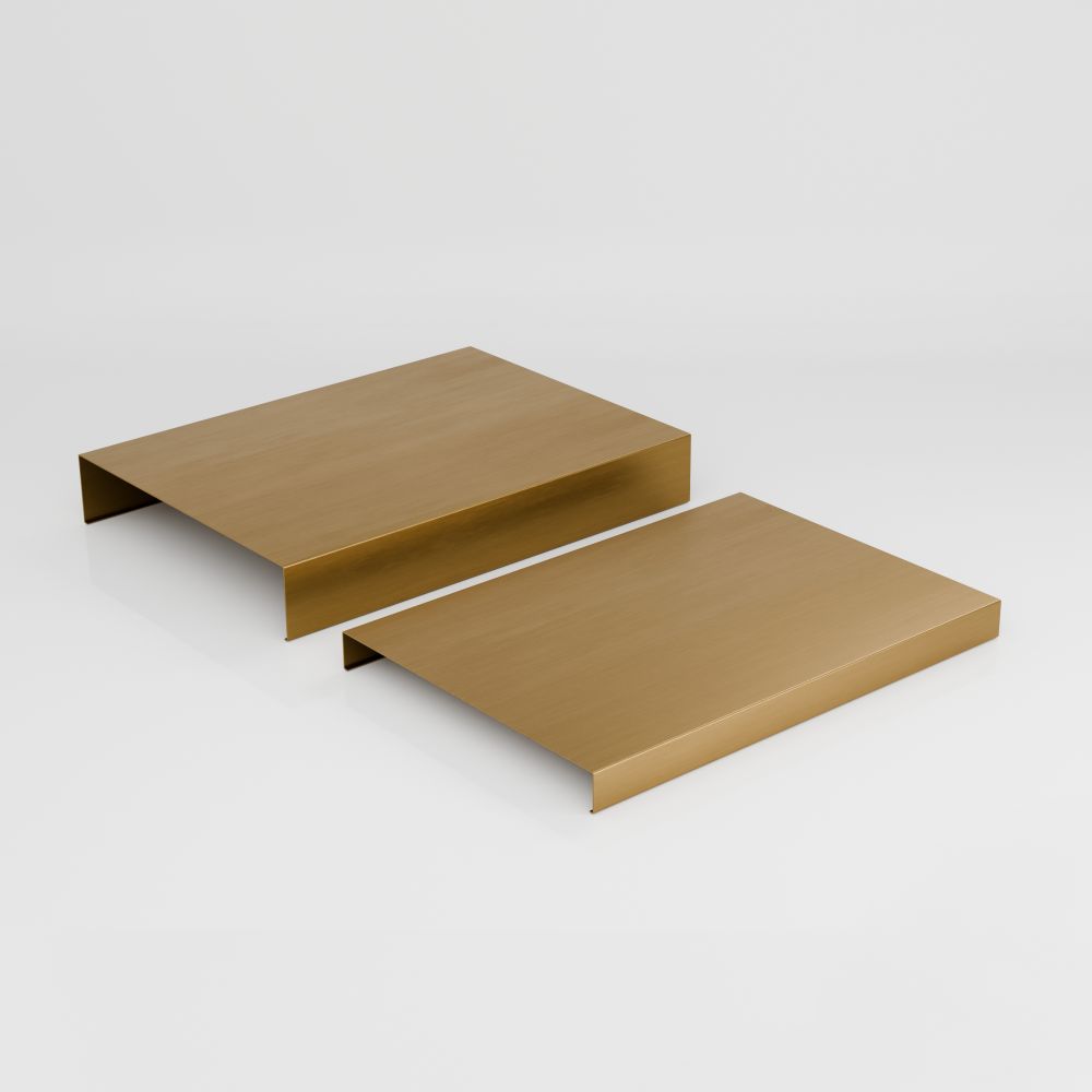 The ES-P-04-GB set includes two stylish display trays of different heights: the larger 40 × 29 × 6 cm and the smaller 39 × 28 × 3 cm. Both feature a sophisticated brushed gold matte finish, creating a cohesive and functional arrangement, ideal for showcasing jewelry, accessories, cosmetics, or premium products.