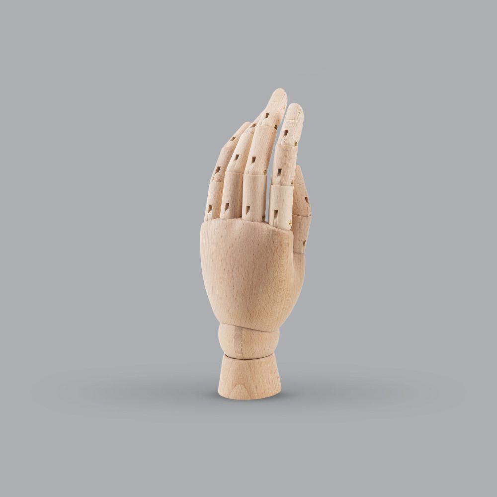 The wooden male hand allows for multidimensional adjustment with its movable fingers that can be arranged freely. You can customize it to the specifics and character of the presented products, giving them individual expression.