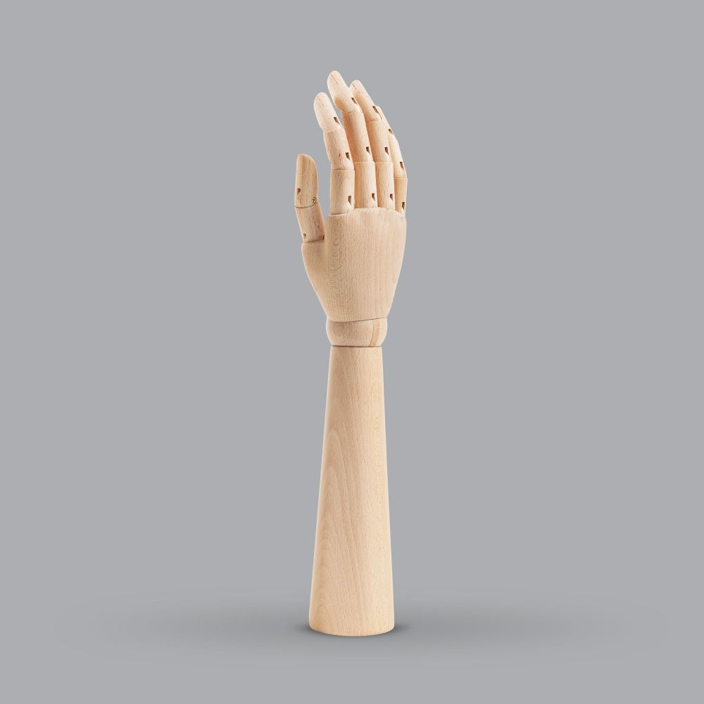 Our men's wooden hand is an exhibition element that bestows a unique character upon your display. Its natural appearance captivates customers, and the wood craftsmanship adds a touch of nobility and sophistication. By combining it with tailoring mannequins, you can create a multi-tiered display that stands out among others. It's the tallest display stand, ensuring maximum visibility for the showcased products.