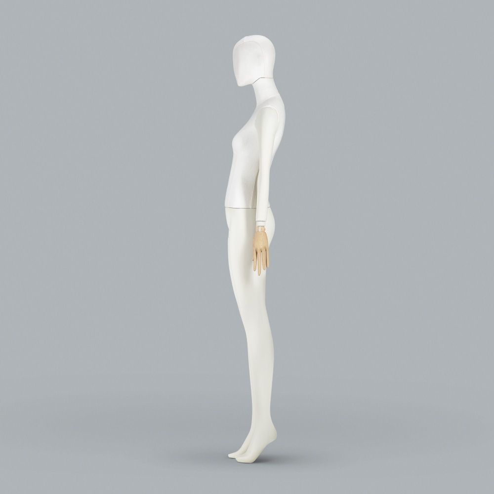 The mannequin is made from natural materials such as cotton and wood. The legs are made of fiberglass, ensuring durability and stability. The torso and head are covered with beige canvas, and the decorative details on the head give it an elegant character.
