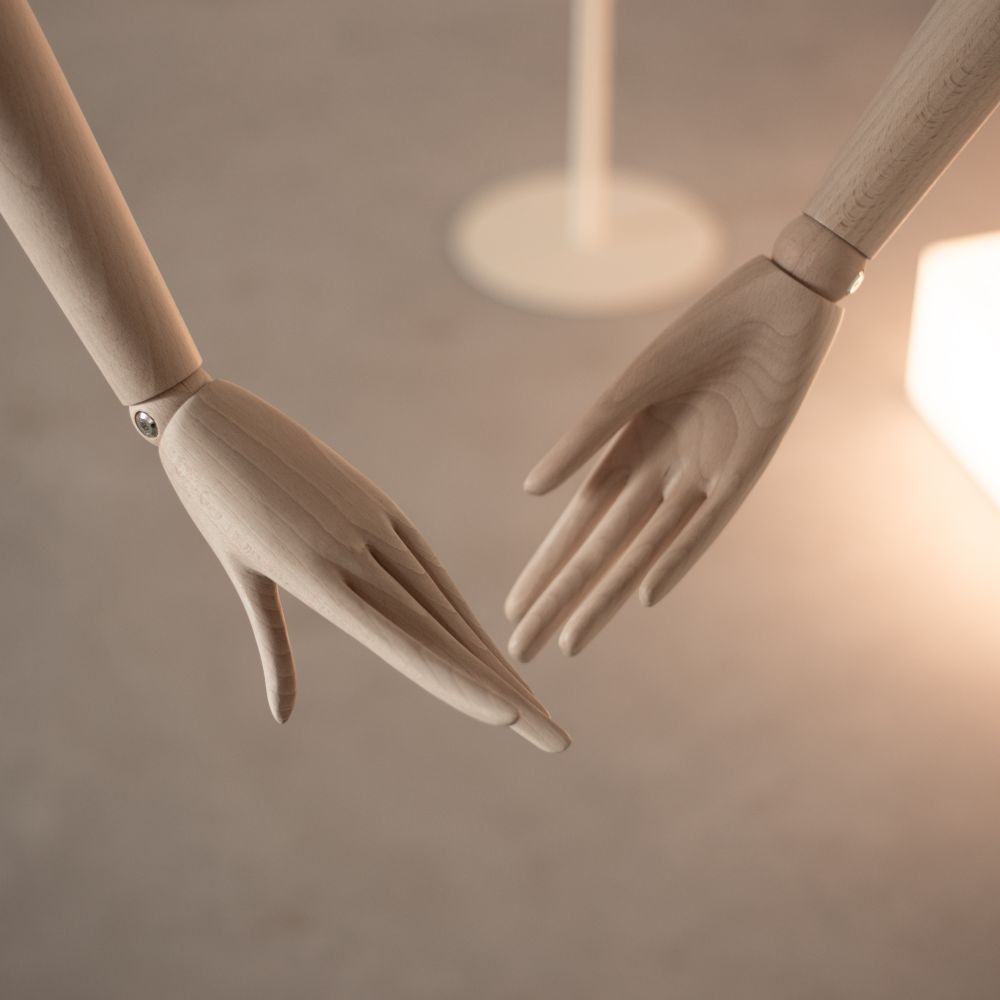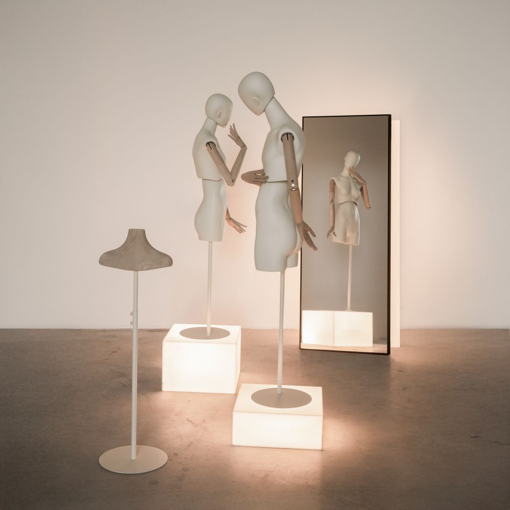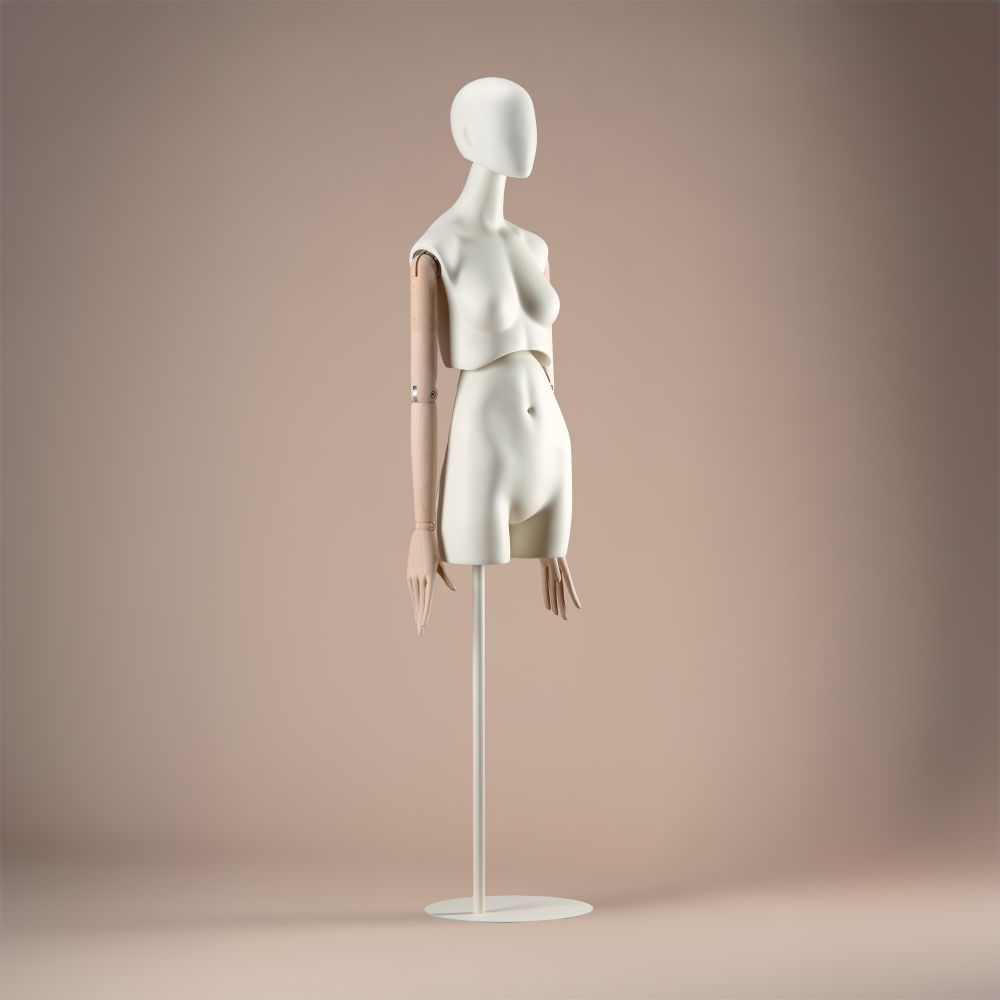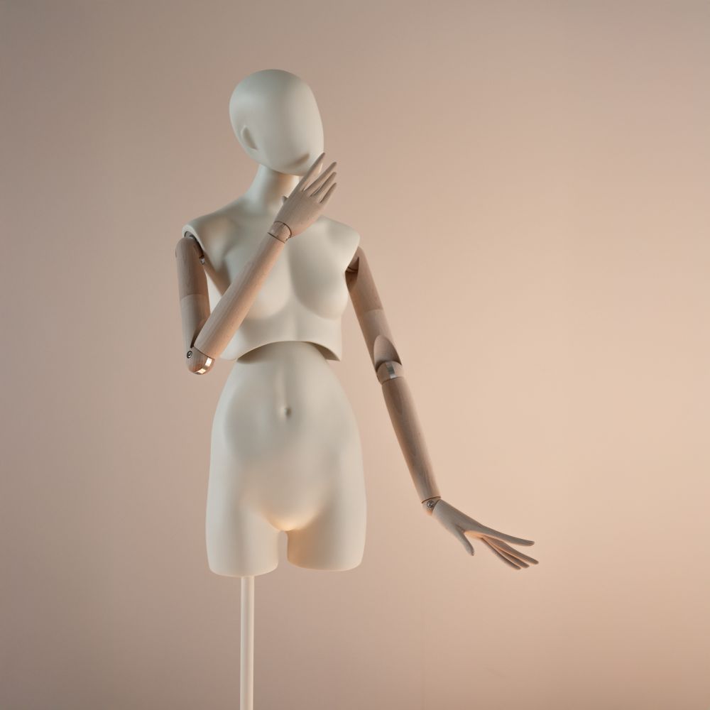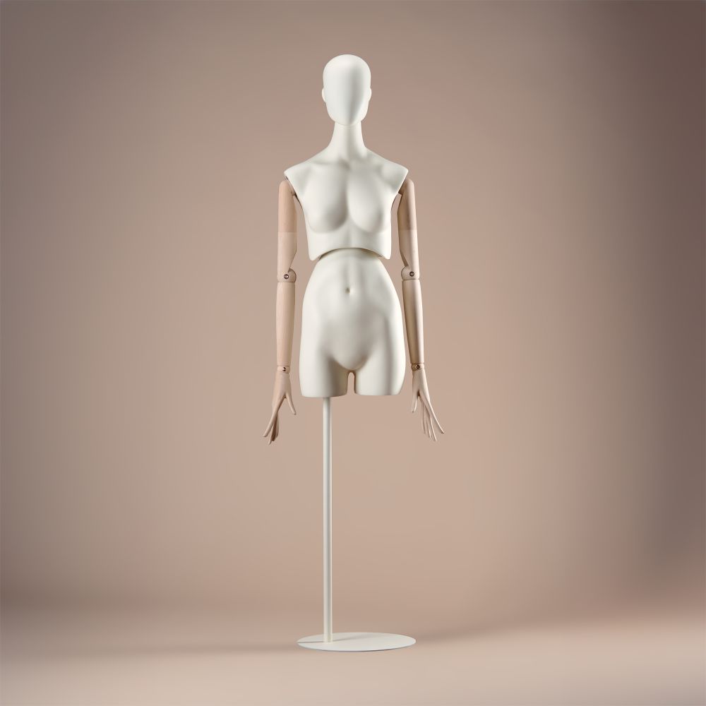 The LUF-T female clothing mannequin torso is a modern solution for displaying garments and accessories. Its adjustable torso can rotate and tilt, allowing for precise positioning to match any creative vision. The movable wooden arms add a touch of natural elegance, while the stable metal base in a matching RAL9010 shade ensures both functionality and aesthetic harmony.