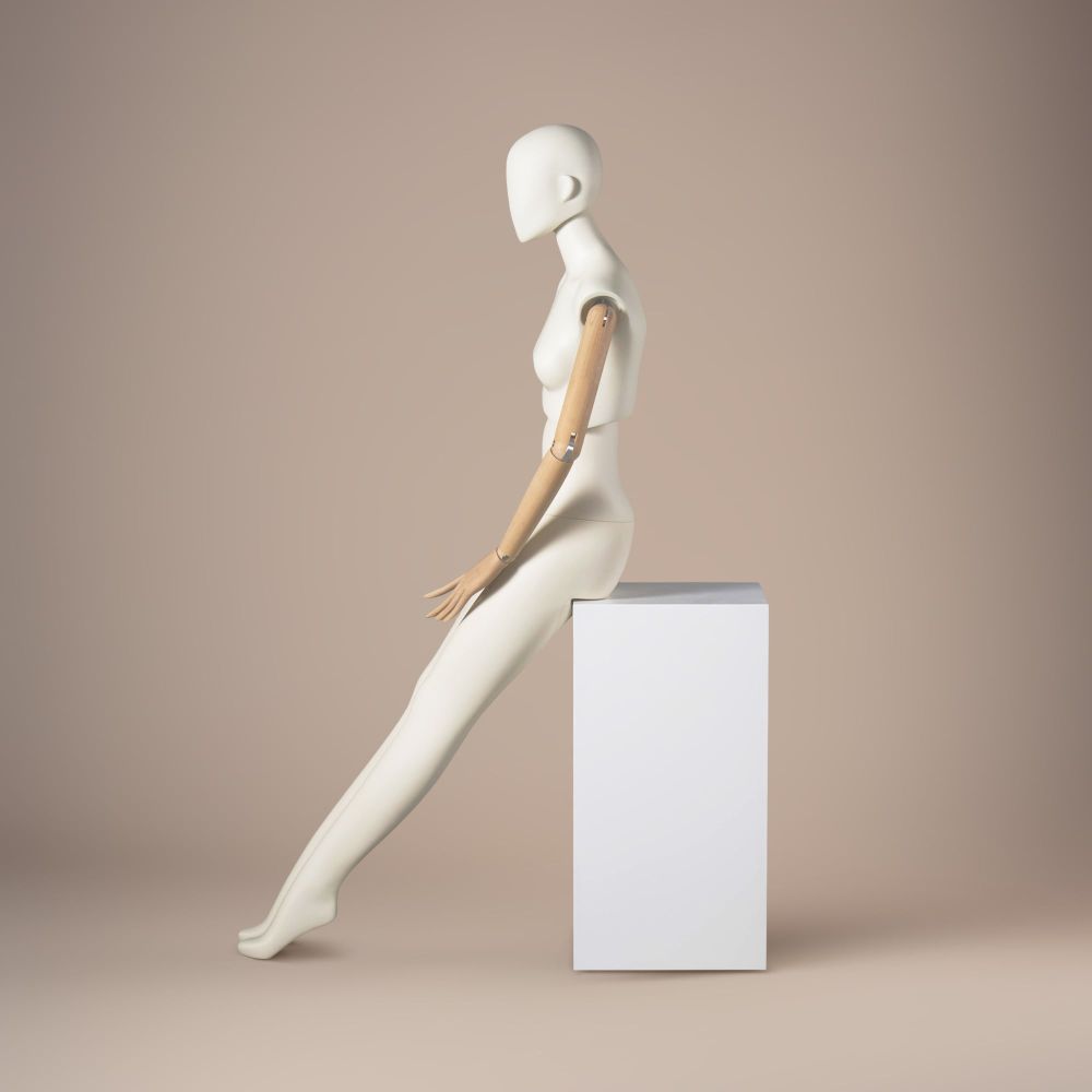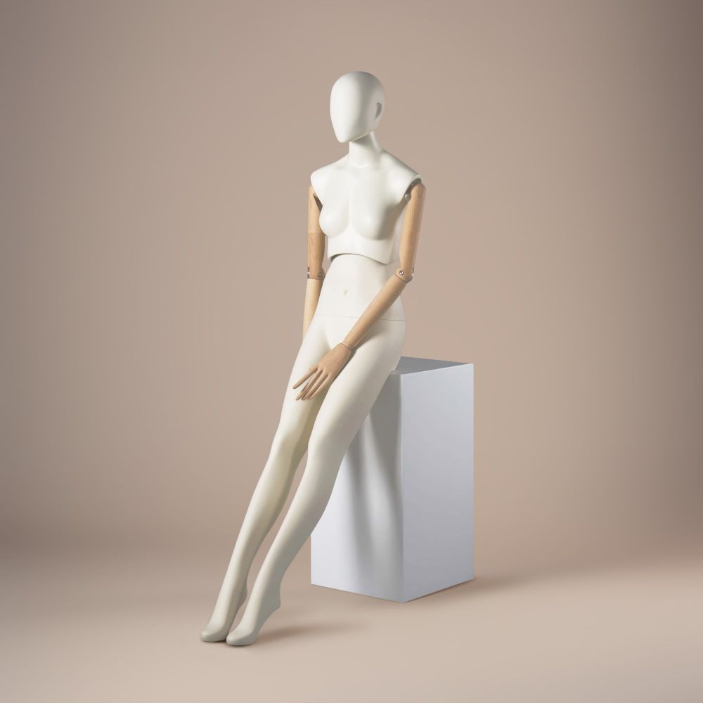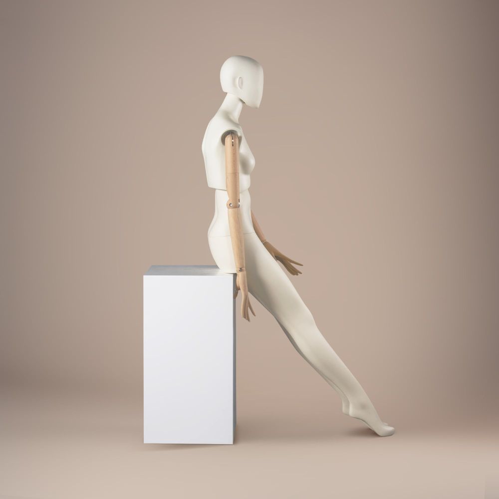 LUF2-A is a stylish female fashion mannequin, designed for premium displays. Thanks to its innovative construction, it allows full flexibility in presentation – the torso can be rotated and tilted for dynamic showcasing of collections. The movable head with adjustable angle and natural wooden arms with finely sculpted hands give it a distinctive character. Finished in broken white RAL9010, it perfectly complements modern boutiques and exhibition spaces.