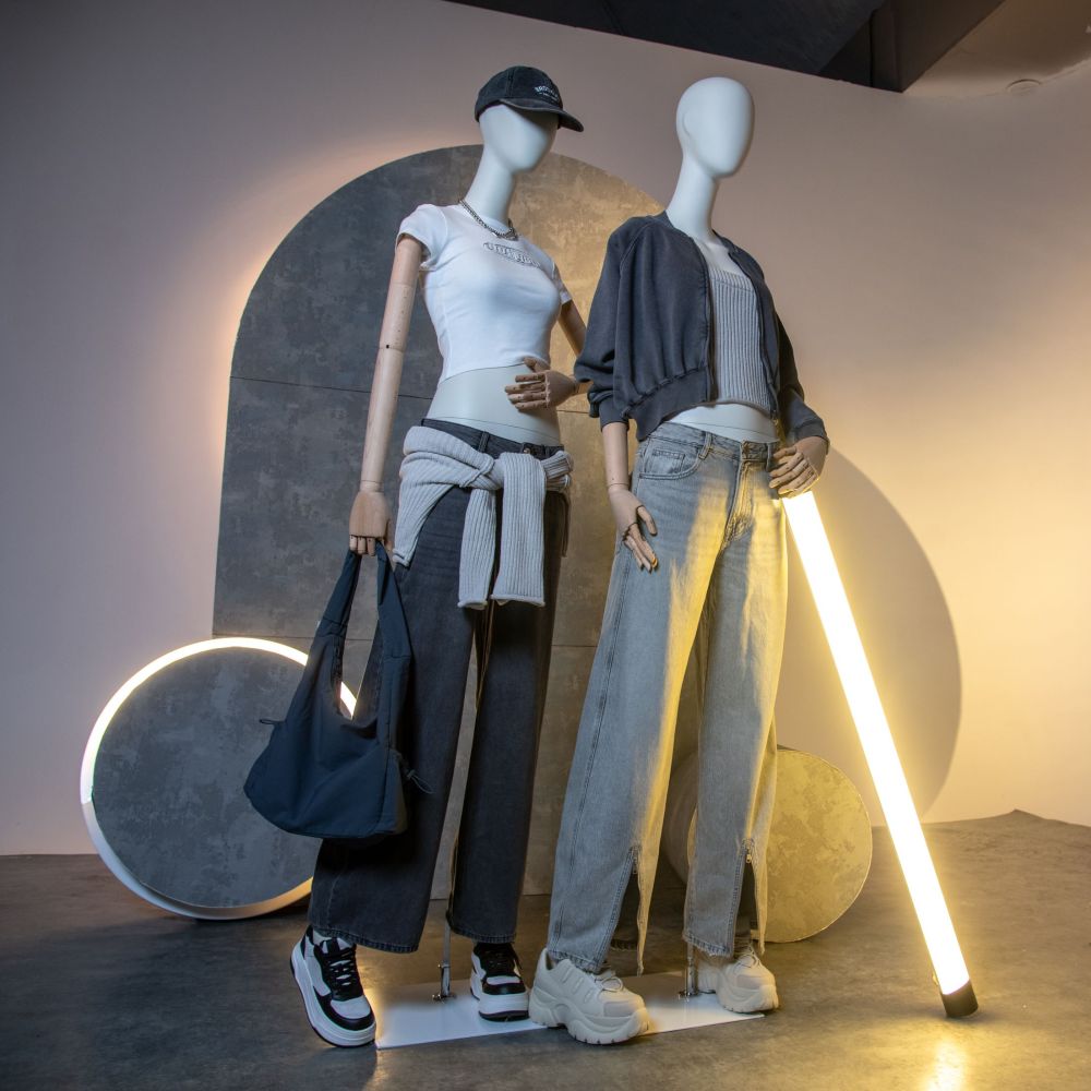What characterises it? The HF2 shop mannequin is a unique combination of functionality, elegance and ecology. The base is an ABS women's mannequin standing slightly apart, complemented by wooden, movable arms that can be positioned according to aesthetic expectations.