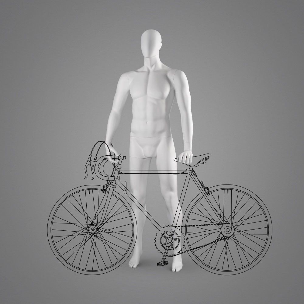 Full body mannequin male STM37 is a great option for shops selling clothing and footwear. The upright posture of the figure means that both casual and sportswear suit it. The curved hand can hold the handlebars so that a bicycle or motorbike, for example, can be attached to it. Thanks to the toe indentation, this product is suitable for the presentation of flip-flops. Our products are resistant to mechanical damage. What's more, minor bruises and abrasions can be painted over with the included corrective paint. The metal base, on the other hand, provides sufficient weight so that the full body mannequin male will not topple over. The versatile nature of the White bike mannequin STM37 also means that it can optionally be painted in any (glossy or matte) colour. There is a choice of two head types and arm settings. We recommend the female mannequin STF77 as a counterpart for this model.